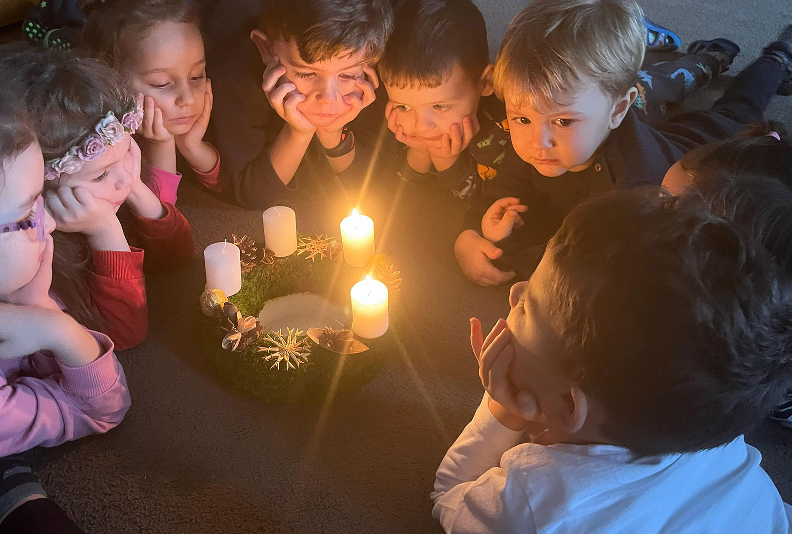 A hétköznapi rohanástól eltérően, a gyermekek közös, mélyen elmélyült pillanatot éltek át az adventi koszorú körül.