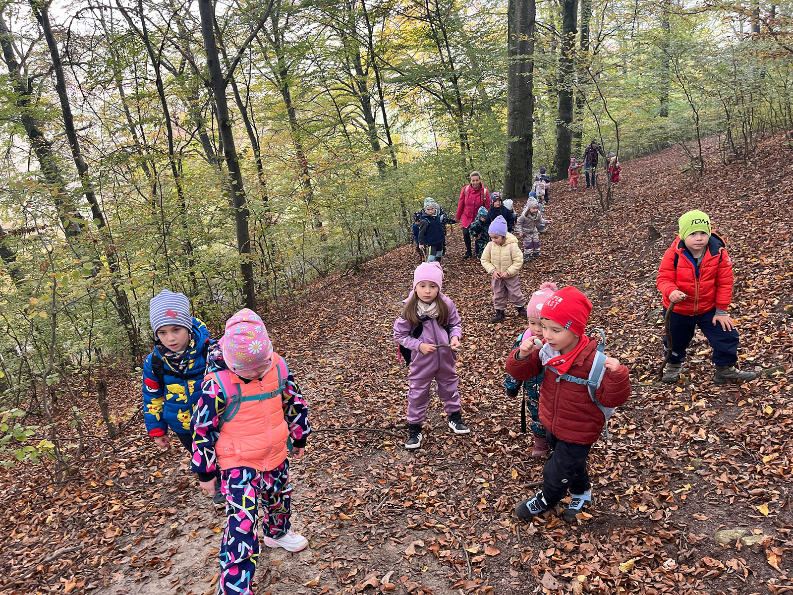A séta során a feladat az volt, hogy mindenki a kosarába gyűjtsön olyan "kincseket", amelyeket az ősz kínál: élénk színű leveleket, makkot, tobozt, mohát, gallyacskákat, különleges formájú kavicsokat vagy elszáradt virágokat.