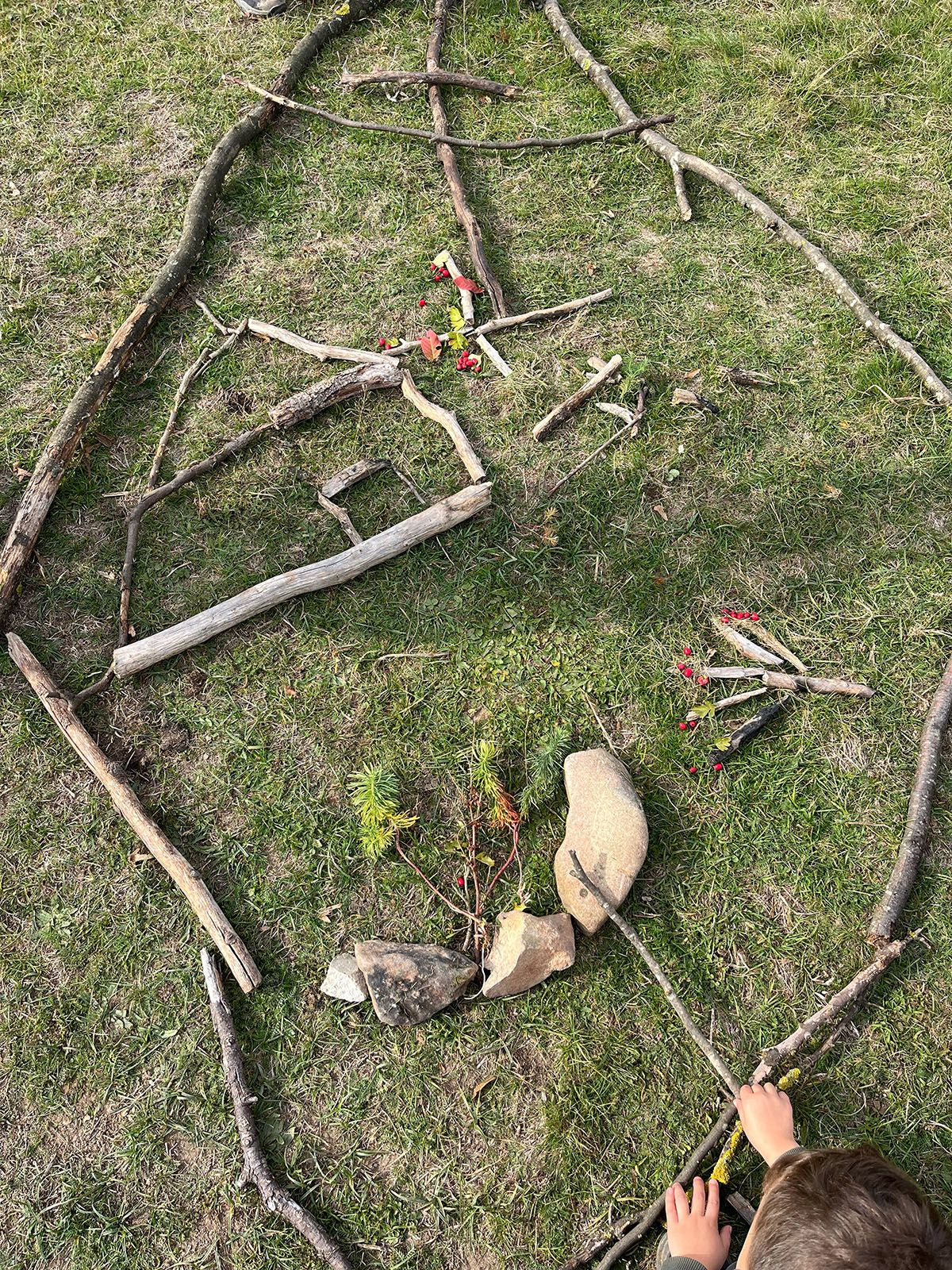 A közös műalkotás a gyűjtött termésekből formálódott meg a földön, koncentrikus körökben, a csoport együttműködésének eredményeként. Minden gyermek hozzájárult a saját kincsével a közös műhöz, megosztva és elrendezve azokat, hogy egységes, harmonikus mintázat jöjjön létre.
