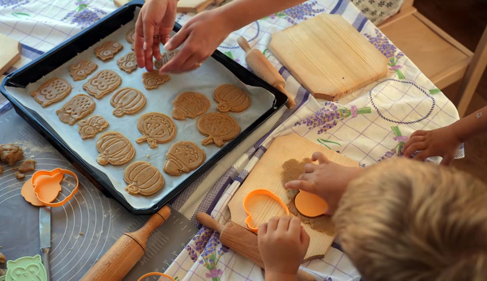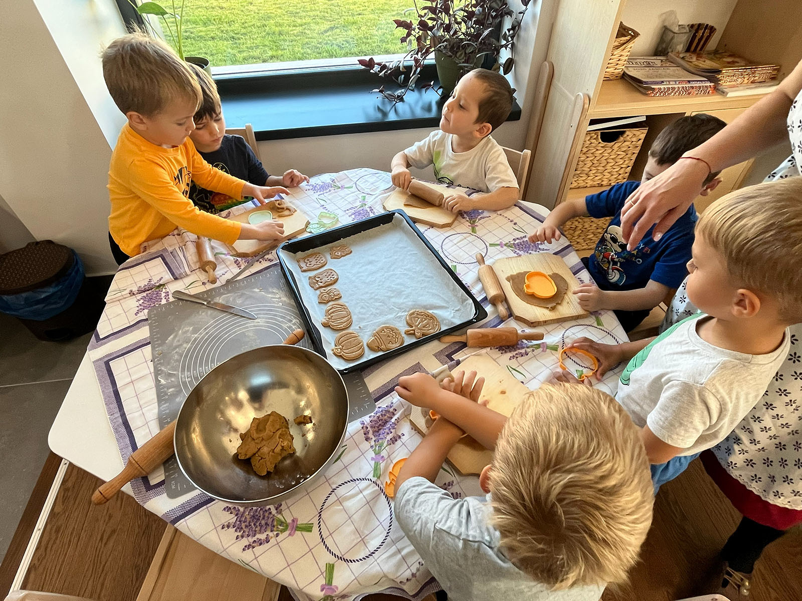 A gyerekek nagy lelkesedéssel dolgoztak: együtt állítottuk össze a tésztát, majd közösen nyújtottuk ki, és különböző tökformák segítségével kiszaggattuk a mézeskalácsokat. A folyamat minden fázisában kipróbálhatták a célként kitűzött technikákat, miközben segítették egymást és örömmel vettek részt a közös munkában.