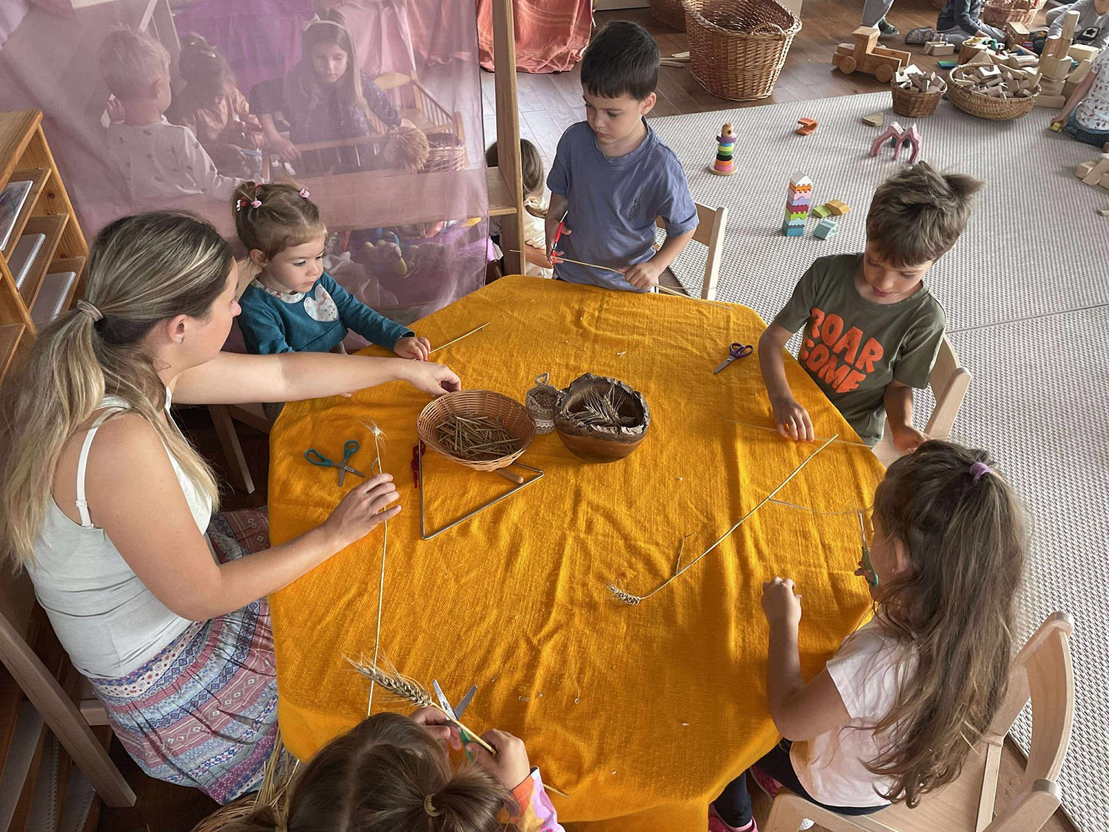 A hét első napján a gyermekek a kalászok fejét eltávolították a szártól. A nagyobbak ollóval vágtak, a kisebbek pedig letörték azokat. A szalmaszálakon keresztül levegőt fújtak, kézbe vették a búzaszálakat, megfigyelték formájukat, színüket, tapintásukat, felsoroltál, megvizsgálták a búzaszál részeit és megnevezték azokat. A kalászok fejét kosárba gyűjtötték. Másnap közösen csépelték ki a búzaszemeket két fakocka közé helyezve a kalászfejeket. Cserélgették egymás között a szemeket, összeszedegették, összehasonlították méretük és színük szerint, közben beszélgettek arról, mire használjuk a gabonát. A harmadik napon a gyerekek örültek annak, hogy a maguk által összegyűjtött búzaszemeket kis asztali malommal megőrölhették, így játékos módon megtapasztalták a gabona őrlésének folyamatát. Szó került a molnár mesterségről és a malom működéséről. Nagy izgalom töltött el minden gyereket, amint a szemük láttára, a kézi malom forgatása által a búzaszemek helyett finom, fehér liszt pergett ki a malom kerekei közül. A negyedik napon már a lisztet dolgoztuk fel. Közösen kimértük a cipónak való lisztet és egyéb hozzávalókat. A gyerekek egyenként részt vettek a dagasztásban: “Gyúrjuk a tésztát, dagasszuk a tésztát. Te meg, tészta, duzzadj, dagadj! Nehogy ilyen kicsi maradj. Nőj meg nagyra, óriásra. Kisütünk majd szép pirosra.” A tészta kelesztése után, pedig minden gyerek maga formázta meg a saját kis cipóját szép gömbölyűre. A gyerekek izgatottan figyelték, ahogy a megformázott tésztából illatos, ropogós kenyér sül, amelyet végül együtt kóstoltunk meg. Az ötödik napon ehhez a témához válogatott mozgásos, énekes népi gyermekjátékokat, mondókákat énekeltünk és játszottunk el közösen, ami méltó befejezése lett a heti témánknak: A búza útja témakörnek.